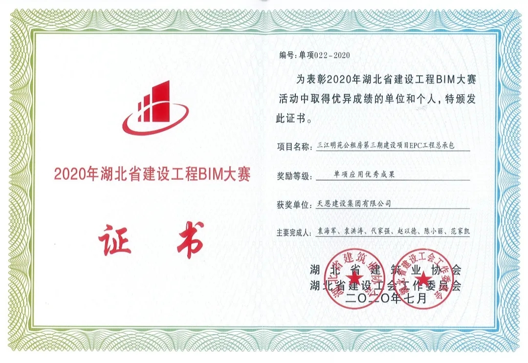 為深入貫徹落實國家建筑業(yè)信息化發(fā)展戰(zhàn)略和住建部的有關(guān)精神,加快推進 BIM 技術(shù)廣泛應用。近日,湖北省建筑業(yè)協(xié)會和湖北省建設(shè)工會工作委員會共同舉辦了2020年湖北省建設(shè)工程BIM大賽。經(jīng)過專家組按照既定評審程序,由天恩建設(shè)集團有限公司申報的三江明苑公租房第三期建設(shè)項目(EPC工程總承包)獲得” BIM 單項應用類”優(yōu)秀成果獎。